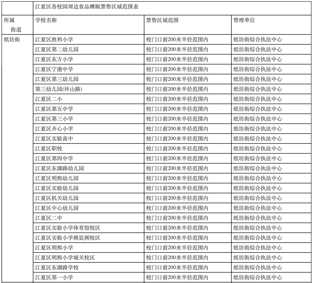 江夏区各街道办事处划定了中小学校及幼儿园周边食品摊贩禁售区域范围,现予以公告。