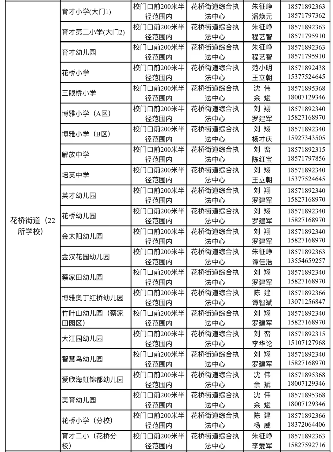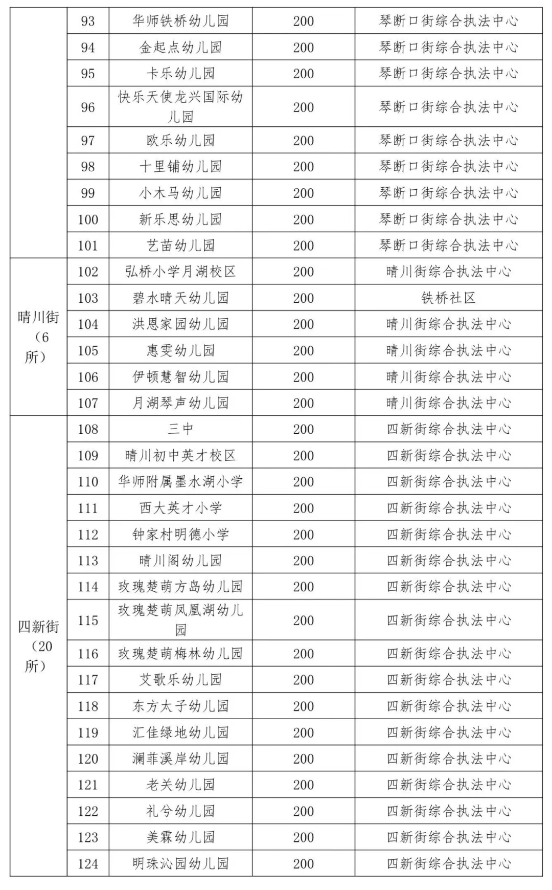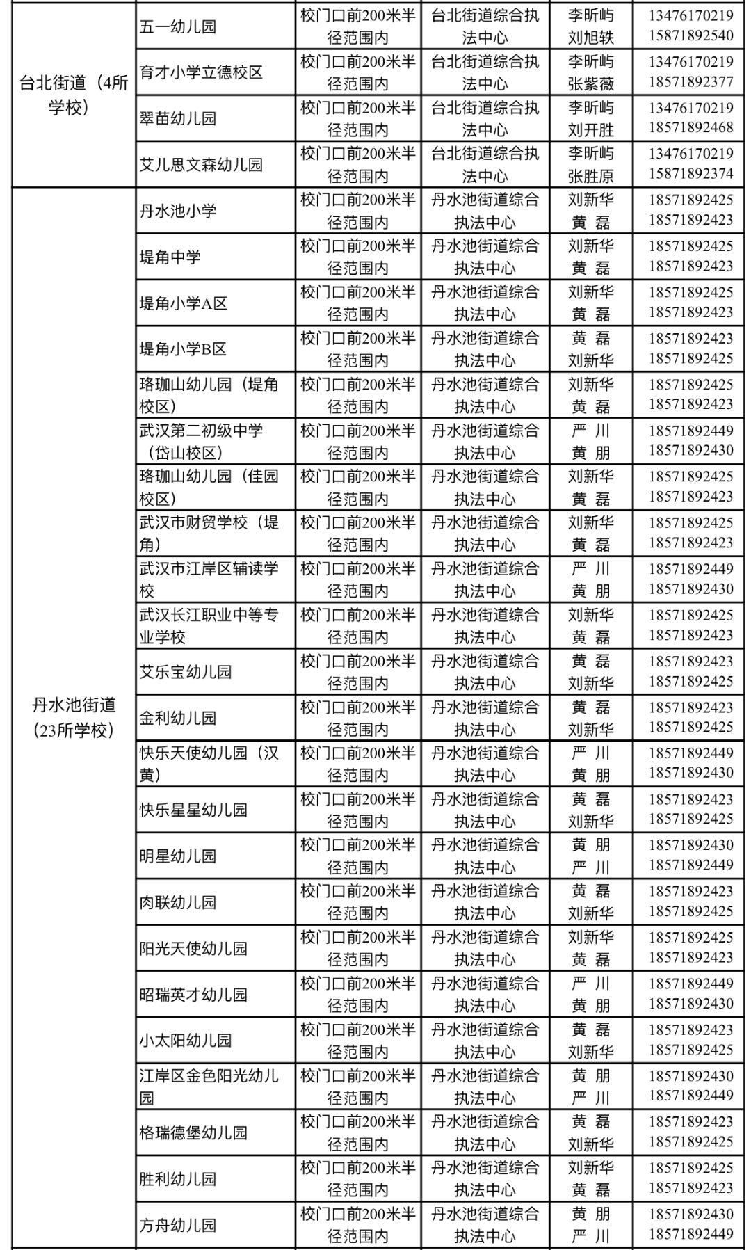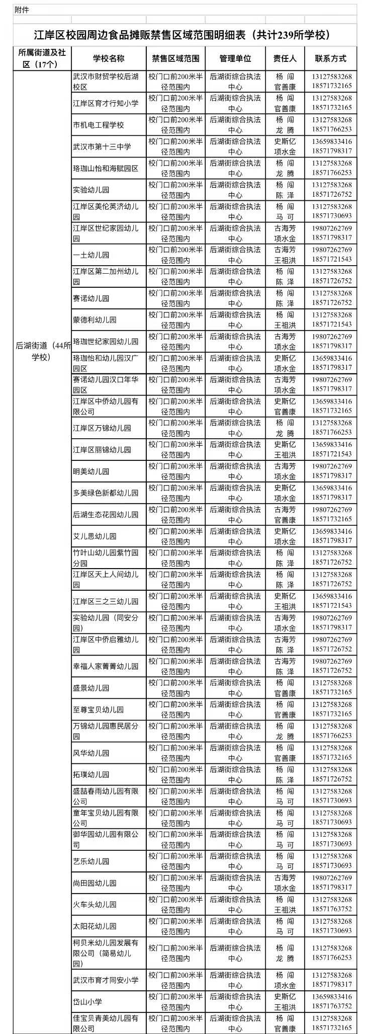 截至2022年7月8日,江岸区16个街道办事处及1个社区管委会,全部划定了239所中小学校及幼儿园周边食品摊贩禁售区域范围,现予以公告。
