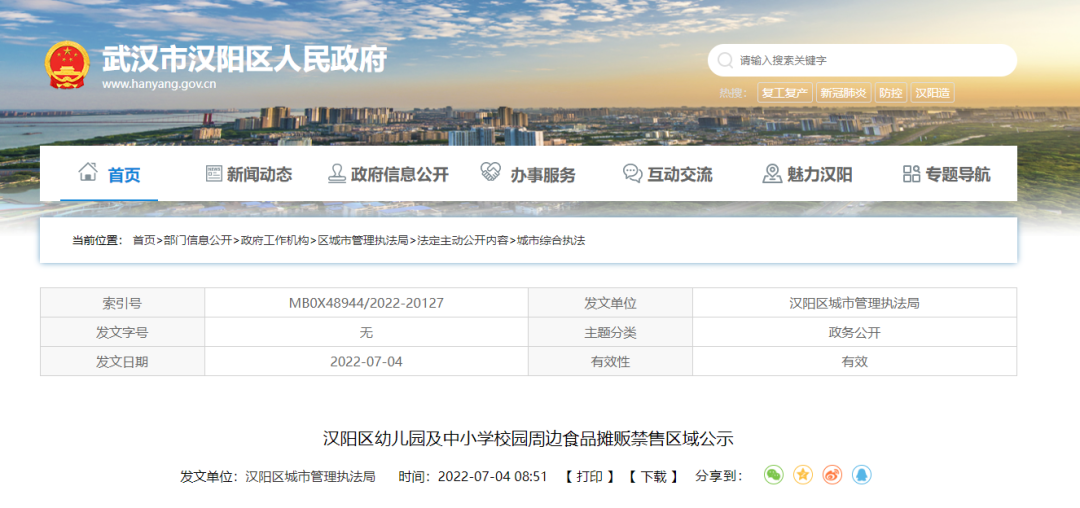 7月12日,武汉市江汉区人民政府官网发布《江汉区校园周边食品摊贩禁售区域公告》。江汉区各街道办事处划定了139所中小学校及幼儿园周边食品摊贩禁售区域范围,现予以公告。