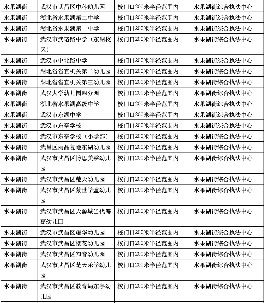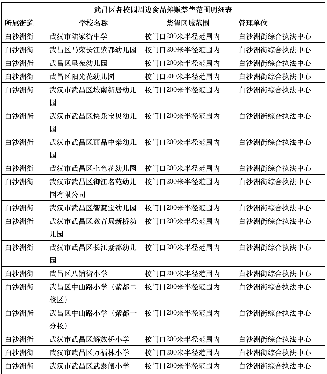 武昌区各街道办事处划定了中小学校及幼儿园周边食品摊贩禁售区域范围,现予以公告。
