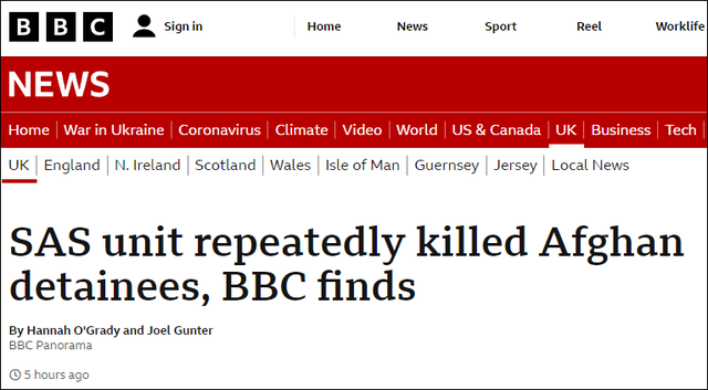BBC在研究军方报告、往来邮件、现场弹孔照片等证据后的最新调查报告显示,在阿富汗的英国特种空勤团(SAS)成员多次在可疑的情况下杀害被拘押者和手无寸铁的人,甚至各中队间还存在比拼“谁杀的人更多”的情况。其中一支部队可能在为期6个月的轮驻期间非法杀害了54人。