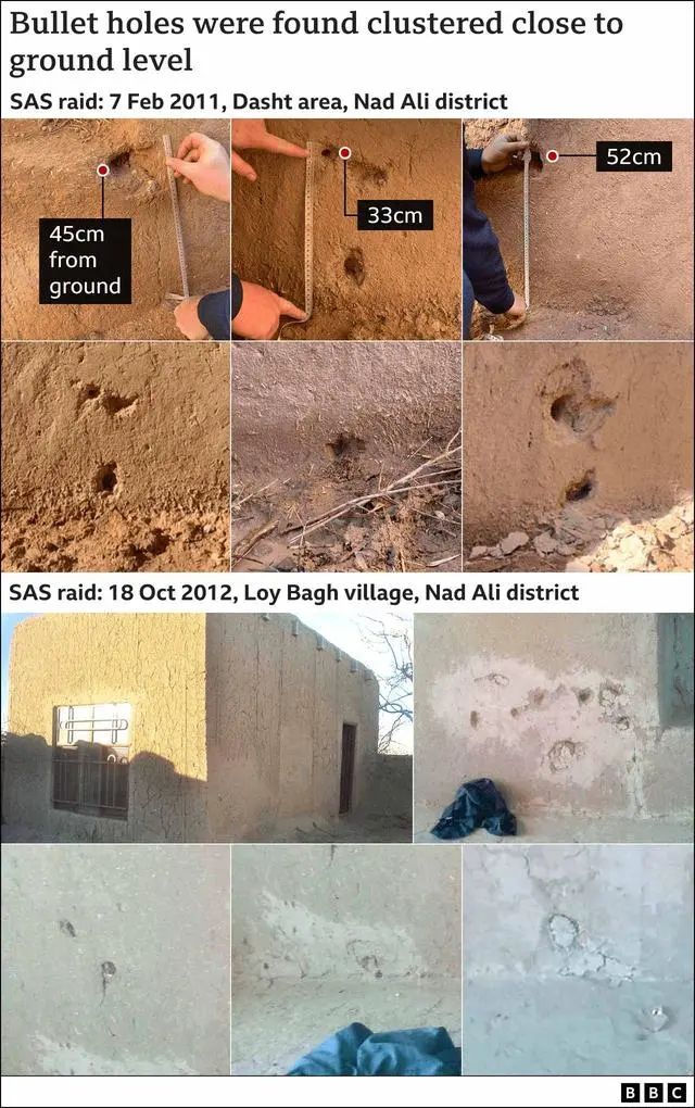 BBC调查的另外两处地点,情况也都一样,弹道学专家看完照片后都认为,弹孔表明可能是“处决式杀人”,而不是“交火”。一名不愿透露姓名的皇家宪兵队调查员说:“弹孔在距离地面如此之低的墙上,似乎戳破了特种部队对于事件的说法。”