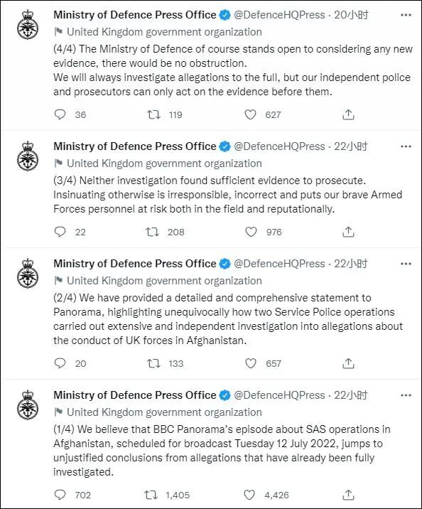此外,英国国防部新闻办公室还在推特上连发数条推文,指责BBC的节目是在已全面调查过的指控中得出了不合理的结论,这两项已进行广泛而独立的调查都未找到足够起诉的证据,BBC在其他方面的暗示是不负责任的、不正确的,会让勇敢的英军士兵在战场上和名誉上都面临风险。