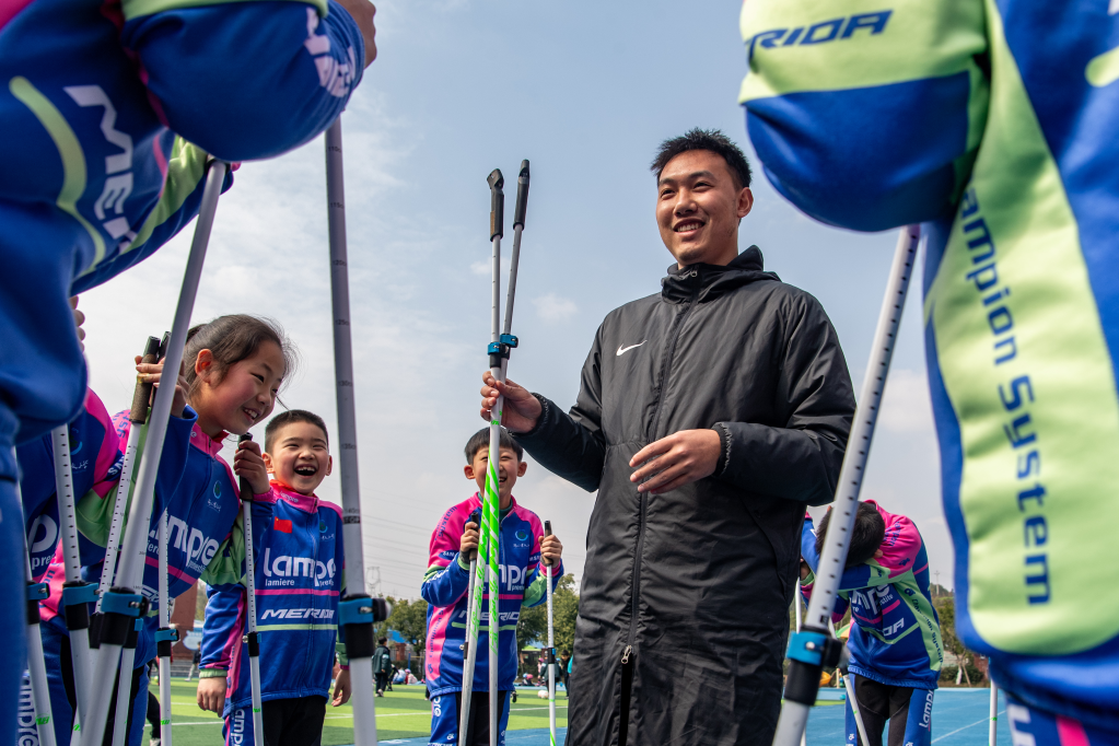2月24日,在重庆树人博文小学的冰雪运动体育课上,体育老师向孩子们讲解旱地滑雪的技术要领。新华社记者唐奕摄