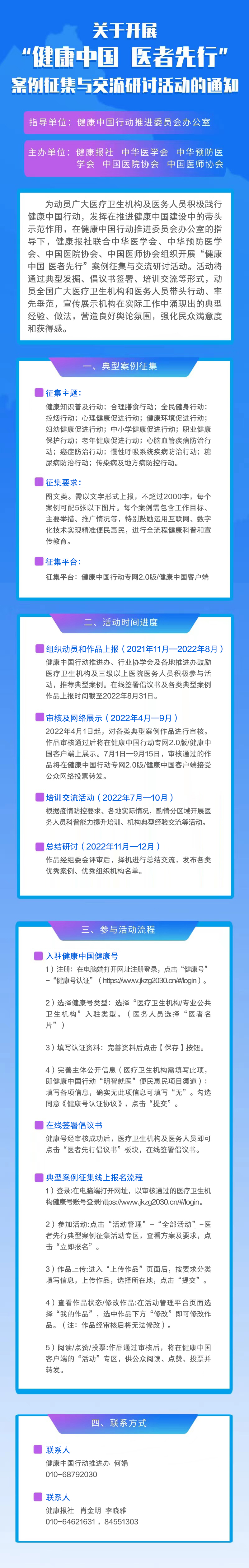 为动员广大医疗卫生机构、专业公共卫生机构及医务人员积极践行健康中国行动,发挥在推进健康中国建设中的带头示范作用,在健康中国行动推进委员会办公室的指导下,健康报社联合中华医学会、中华预防医学会、中国医院协会、中国医师协会主办“健康中国 医者先行”案例征集与交流研讨活动。