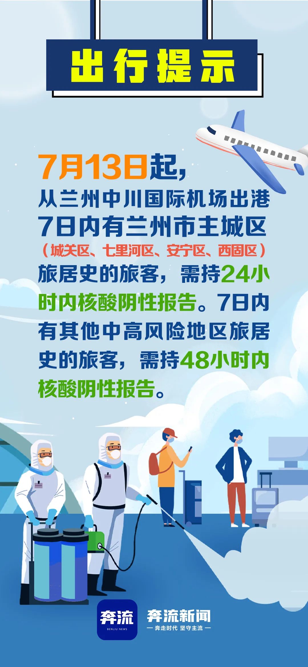 7月13日,兰州中川国际机场公众号发布消息称,根据疫情防控要求,即日起,从兰州中川国际机场出港,7日内有兰州市主城区(城关区、七里河区、安宁区、西固区)旅居史的旅客,需持24小时内核酸阴性报告。7日内有其他中高风险地区旅居史的旅客,需持48小时内核酸阴性报告。