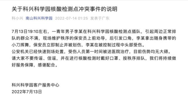 7月13日,广东深圳,科兴科学园一男子核酸插队划伤保安,引发关注。