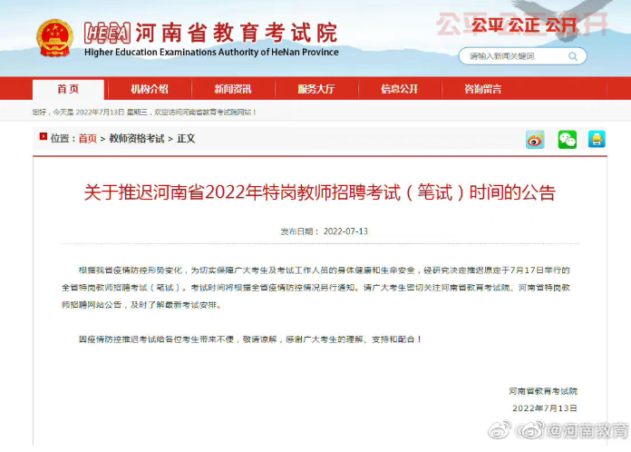 7月13日,河南省教育考试院发布公告称:根据我省疫情防控形势变化,为切实保障广大考生及考试工作人员的身体健康和生命安全,经研究决定推迟原定于7月17日举行的全省特岗教师招聘考试(笔试)。考试时间将根据全省疫情防控情况另行通知。请广大考生密切关注河南省教育考试院、河南省特岗教师招聘网站公告,及时了解最新考试安排。