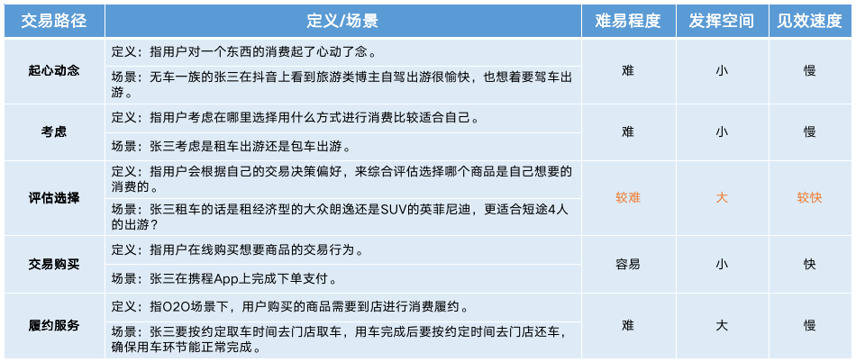 【起心动念】就驾车出游的场景来看,作为租车平台,很难在起心动念层面影响用户,因为用户更多受外部平台的优质内容激发出起心动念,如抖音、朋友國、小红书等平台看到他人分享的各种驾车出游精彩内容,从而激发自己也想去驾车出游。携程在内容种草和需求激发方面,还是没有太多的优势。【考虑】驾车出游主要考虑包车或租车出游方式,以及在携程、神州等线上平台或线下门店消费。考虑范国小、可选择不多、交易金额相对不高、决策时间短,综合来说属于轻决策场景。携程作为租车交易平台没必要投入过多精力在用户考虑环节。【评估选择】选的是车和门店。用户对车和门店有核心关注点,且存在主辅优先级。当用户在租车交易平台上便捷的看到这些核心关注点,才会促使用户进行快速的消费下单。由于不同用户画像核心关注点有所差异,比如自驾游用户关注车性能好、商务差旅用户关注门店是不是在高铁站附近。此环节是决定用户消费的核心环节,平台应该把精力投入到此环节,识别出用户主决策因子、辅助决策因子,并将其进行线上化、标准化,从而提高用户的交易決策效率。【交易购买】 主要决策因素:价格+履约保障。价格代表的是线上价格合理或有优惠,不能比线下到店贵;履约保障代表的是商家对服务流程的承诺,如3天后有车可以租,无车可免费升级。【履约服务】 主要解决用户到店履约时的坑点/ 痛点。履约服务质量会影响新用户下单和老用户复购,平台需要花精力输出商家履约服务标准、监控商家履约服务质量、建立履约服务奖惩机制,让用户去平台上的任何商家消费时,都能感受到统一标准的履约服务。2)识别增长机会点