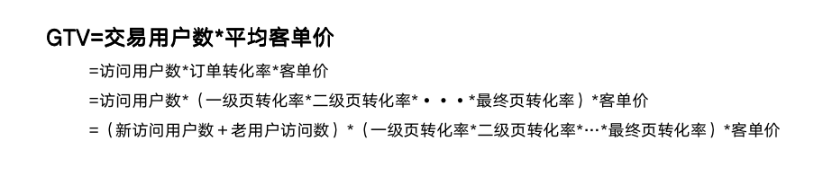 假设要提高GTV,可以采取保持转化率和客单价不变,提高访问用户数。或者是保持访问用户数和客单价不变,提高转化率。总之可以有N种方式,来提供整体的GTV。