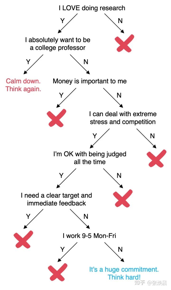 为了帮助大家认真思考这个问题,我画了一棵决策树。想要读博的同学不妨走一下这棵树。Good luck!