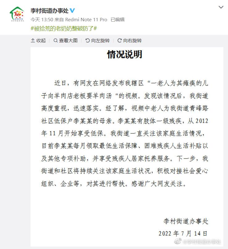 信网7月14日讯 7月14日,李村街道办事处发布情况说明称,近日,有网友在网络发布辖区“一老人为其瘫痪的儿子向羊肉店老板要羊肉汤“的视频。发现该情况后,李村街道高度重视,迅速落实。