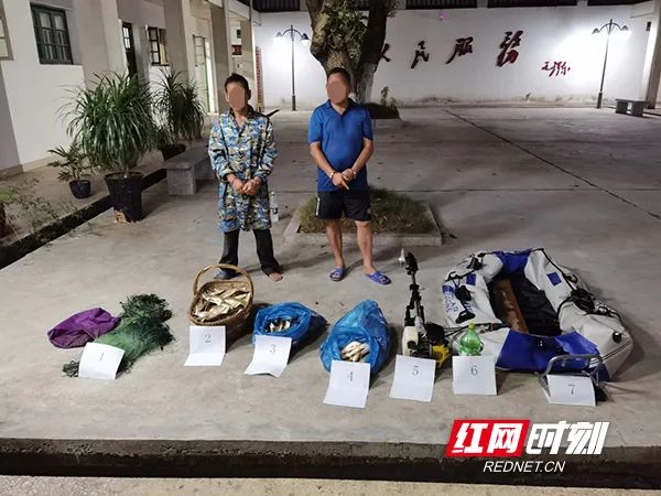 省督何某华、李某等人非法捕捞水产品案抓获的两名犯罪嫌疑人和收缴的非法捕捞工具