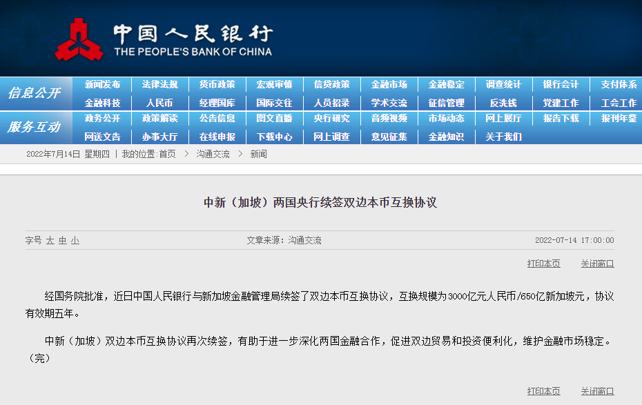 据央行官网7月14日消息,经国务院批准,近日中国人民银行与新加坡金融管理局续签了双边本币互换协议,互换规模为3000亿元人民币/650亿新加坡元,协议有效期五年。