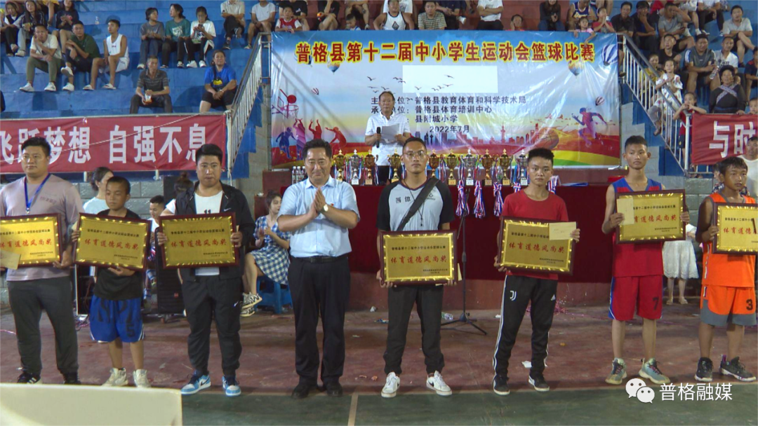 7月12日晚上,普格县第十二届中小学生运动会篮球比赛在灯光球场圆满落幕。县教体科局等相关部门负责人参加闭幕式,并为获奖球队和优秀裁判员颁奖。