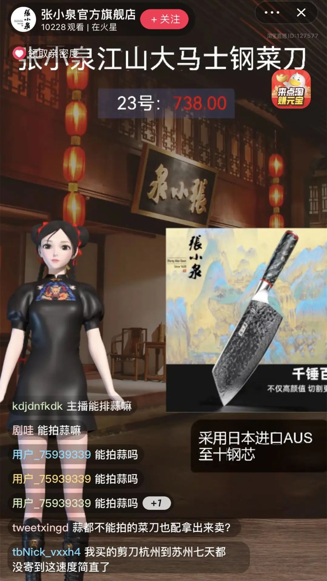 14日上午8时许,记者注意到,张小泉官方旗舰店正在进行直播带货,在介绍一款售价为738元的菜刀时,大量网友发弹幕询问相关菜刀是否可以拍蒜。