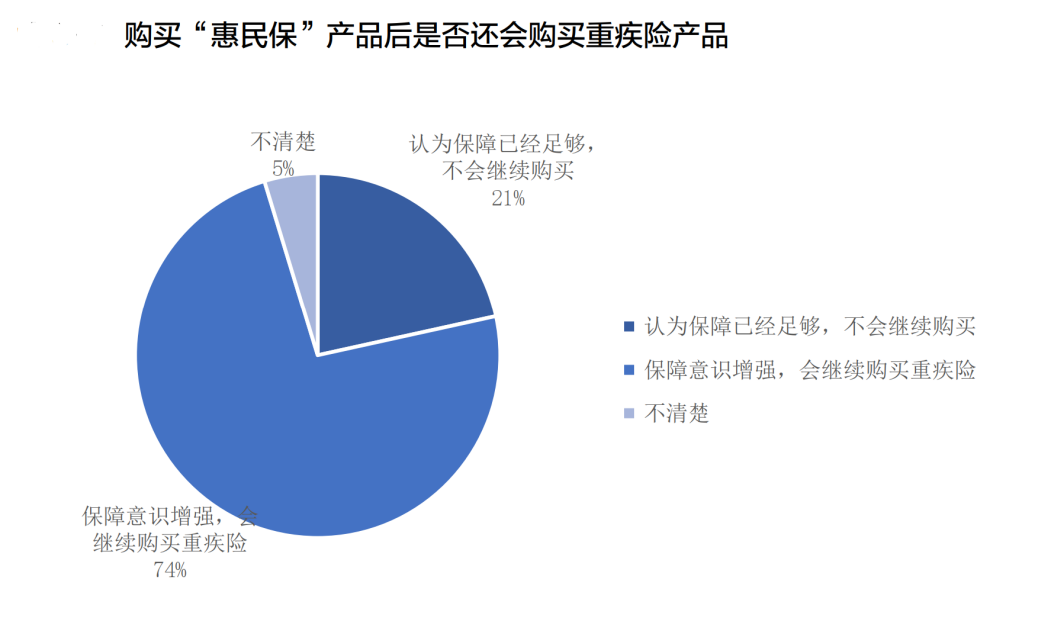 调查结果显示,有53%的受访者购买了“惠民保”产品,购买比例高达一半以上。在已购买“惠民保”的消费者中,有21% 表示在购买了“惠民保”后,他们“认为保障已经足够,不会继续购买重大疾病保险”;74%认为“保障意识增强,会继续购买重疾险”,这体现“惠民保”并没有很严重挤出其他商业健康保险,相反通过“惠民保”的宣传引导更加提高了居民的保险保障意识。但是,保障意识的提高并不等于保险产品的购买,在消费者收入水平和消费能力有限、对保险产品认知不足的情况下,更可能选择看上去性价比更高的“惠民保”,进而挤出对其他商业健康保险尤其是重疾险的购买。