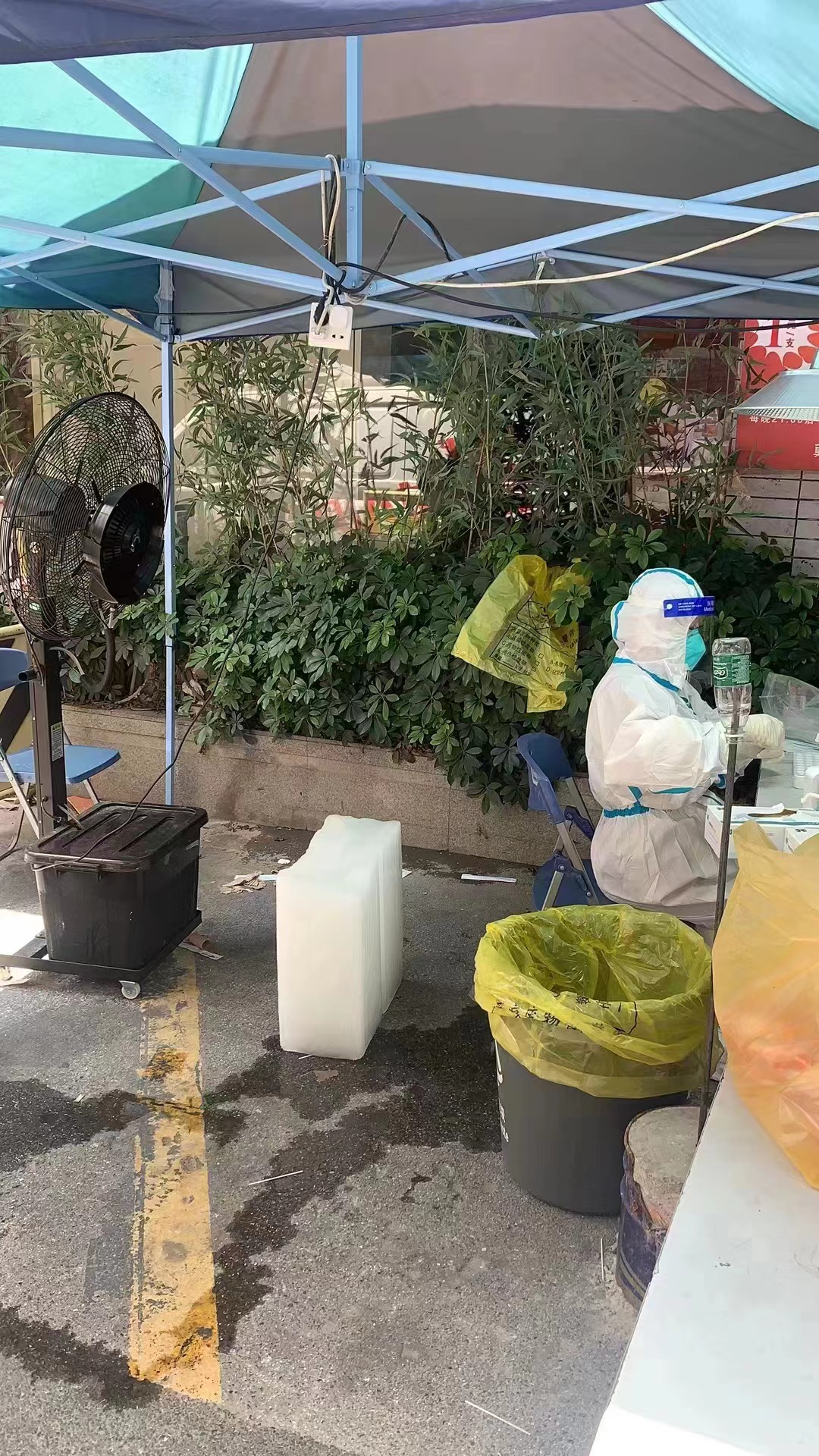 广州日报·新花城巡城记者在海幢街宏宇社区检测点现场看到,这里在“大白”后面,放置了一台工业风扇,风扇不仅吹出凉风,还会喷出水雾,让清爽更凉快一点。为了为现场进一步降温,现场还在风扇前放置了一块冰块,让风扇吹出的凉风更凉快。