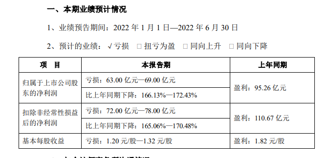 牧原股份的业绩预告显示,预计今年上半年归母净利润亏损63亿元~69亿元,同比下降166.13%~172.43%;扣非净利润亏损72亿元~78亿元,同比下降165.06%~170.48%。
