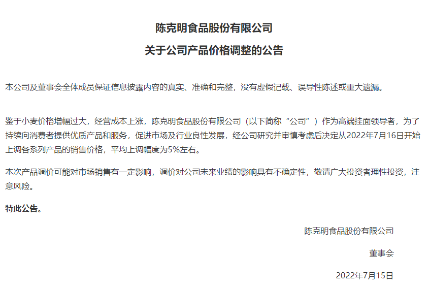 【环球网综合讯】7月14日消息,克明食品发布公告称,鉴于小麦价格增幅过大,经营成本上涨,经公司研究并审慎考虑后决定从 2022 年 7 月 16 日开始上调各系列产品的销售价格,平均上调幅度为 5%左右。