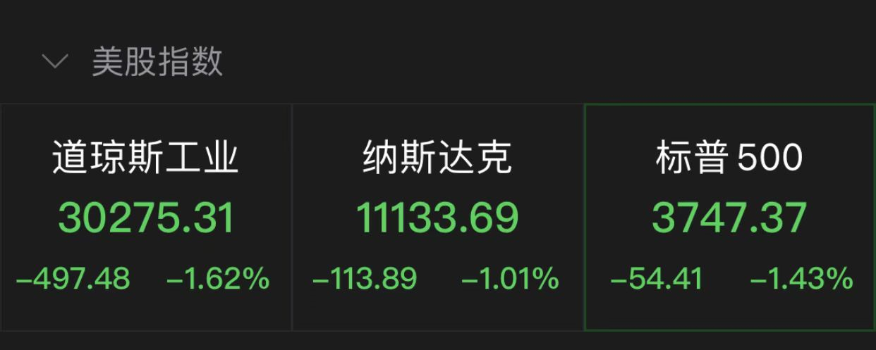 中新经纬7月14日电 14日晚间,美三大股指集体低开,大跌逾1%。截至发稿,道指跌1.62%,纳指跌1.01%,标普500指数跌1.43%。
