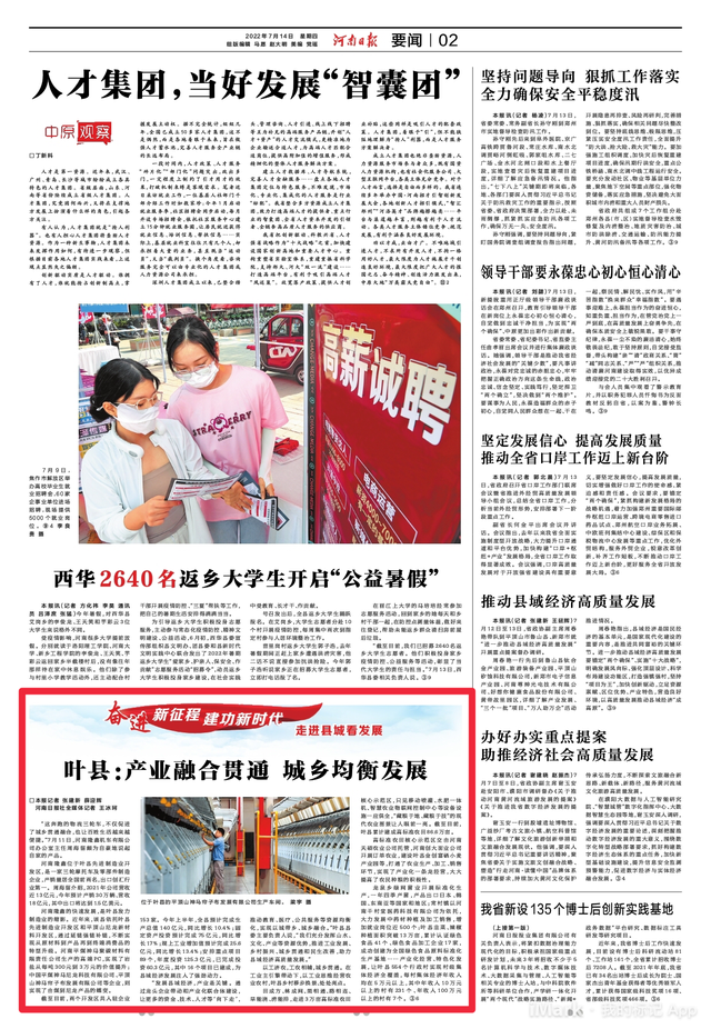 “发展县域经济,产业是关键。通过龙头企业带动和产业化联合体建设,让更多的资金、技术、人才等‘向下走’,推动教育、医疗、公共服务等资源均衡化,实现以城带乡、城乡融合。”叶县县委主要负责人说,“我们充分发挥山水、文化、产业等资源优势,推进工业发展、乡村振兴、城乡贯通和民生改善,助力县域经济高质量发展。”