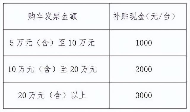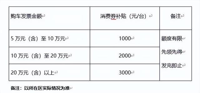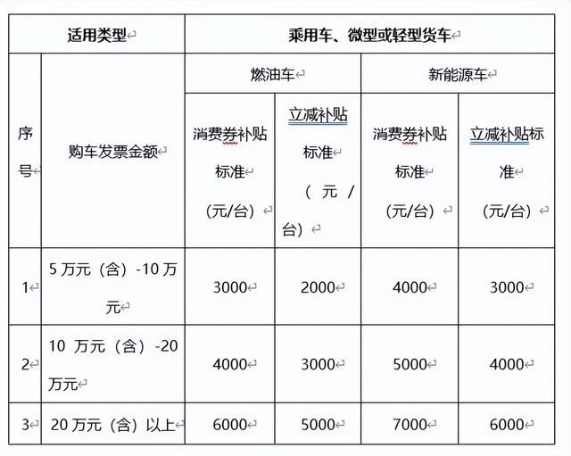 汽博会期间:2022年7月15日-24日(以购车发票时间为准)。补贴资金有限,按资料上传成功的先后顺序,先到先得,发完即止。按购车发票金额分为三档,每档可在消费券(家电、百货、成品油)和立减补贴之间二选一,新能源车辆在此基础上每档多增加1000元消费券或立减补贴,具体标准如下: