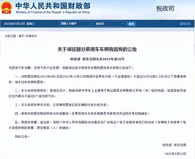 5月31日,财政部、税务总局发布《关于减征部分乘用车车辆购置税的公告》显示,对购置日期在2022年6月1日至2022年12月31日期间内且单车价格(不含增值税)不超过30万元的2.0升及以下排量乘用车,减半征收车辆购置税。