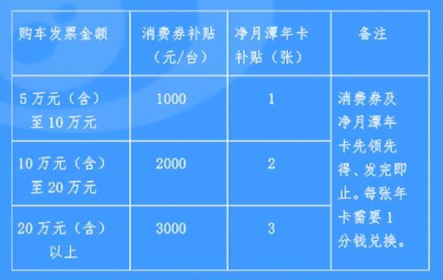 资格获取活动期内(以购车发票时间为准),购买5万元及以上乘用车(包括新能源车购置,不含二手车交易,不含客车、特种用车等非运营车辆)的个人消费者(不限户籍),在长春市公安交管部门办理注册落籍登记手续,可申领净月高新区汽车消费补贴。按购车发票金额(单车销售价格需为购车发票含税金额)补贴分为三档,每档补贴不同金额消费券,同时每档额外补贴不同数量净月潭年卡,消费券可在名单内的限上商场、超市、汽车零售、旅游企业购买百货、旅游、汽车内饰、汽车保养等产品使用,具体标准如下: