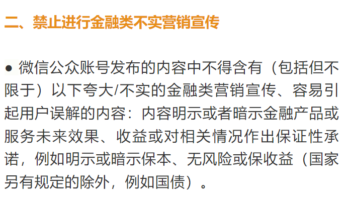 ● 微信公众账号发布的内容中,禁止高收益理财欺诈内容,如推广不正常的高回报理财产品或导流欺诈项目。其中的“导流欺诈项目”通常表现为未明确日化或年化收益,但通过可疑的引导性内容,诱导用户添加个人微信或外链推广高收益理财产品。