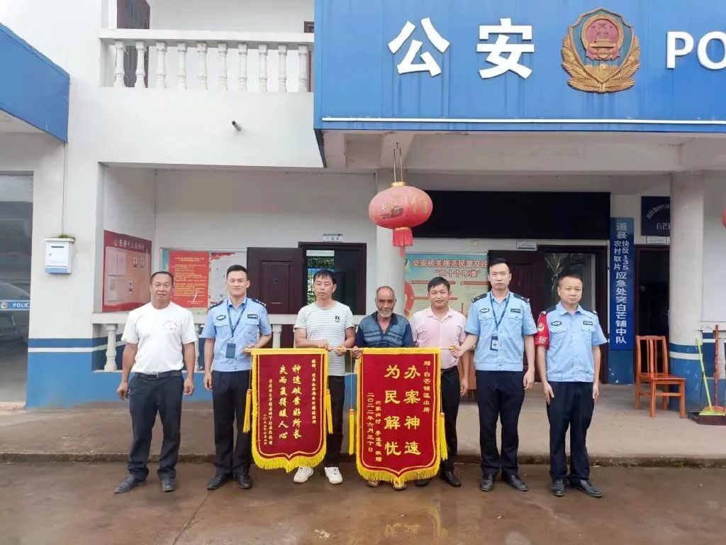 (图为辖区群众将两面锦旗送至白芒铺派出所,感谢民警速破盗窃耕牛案件)