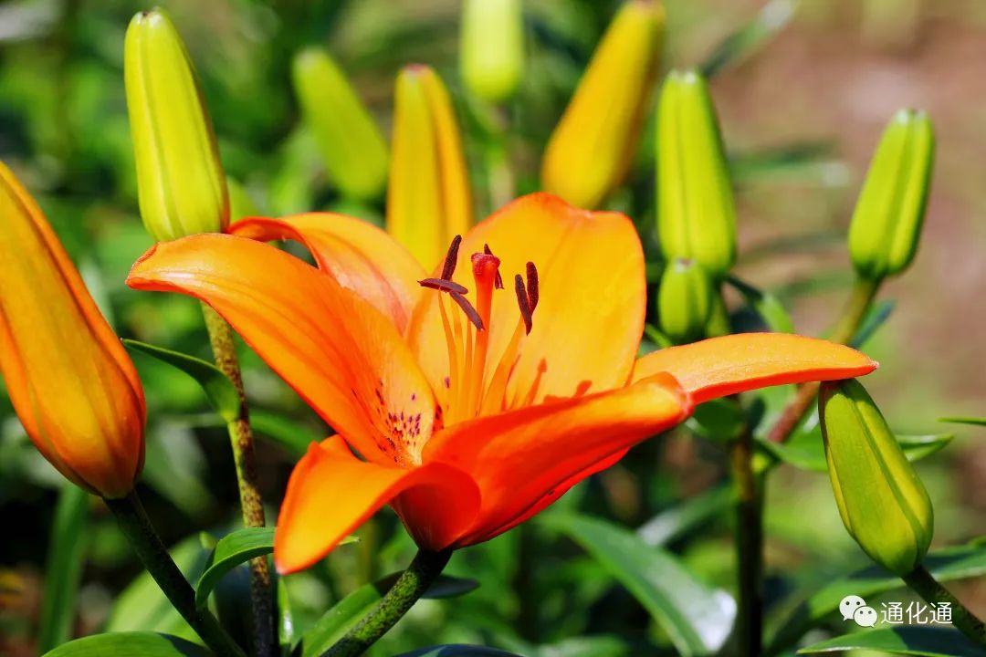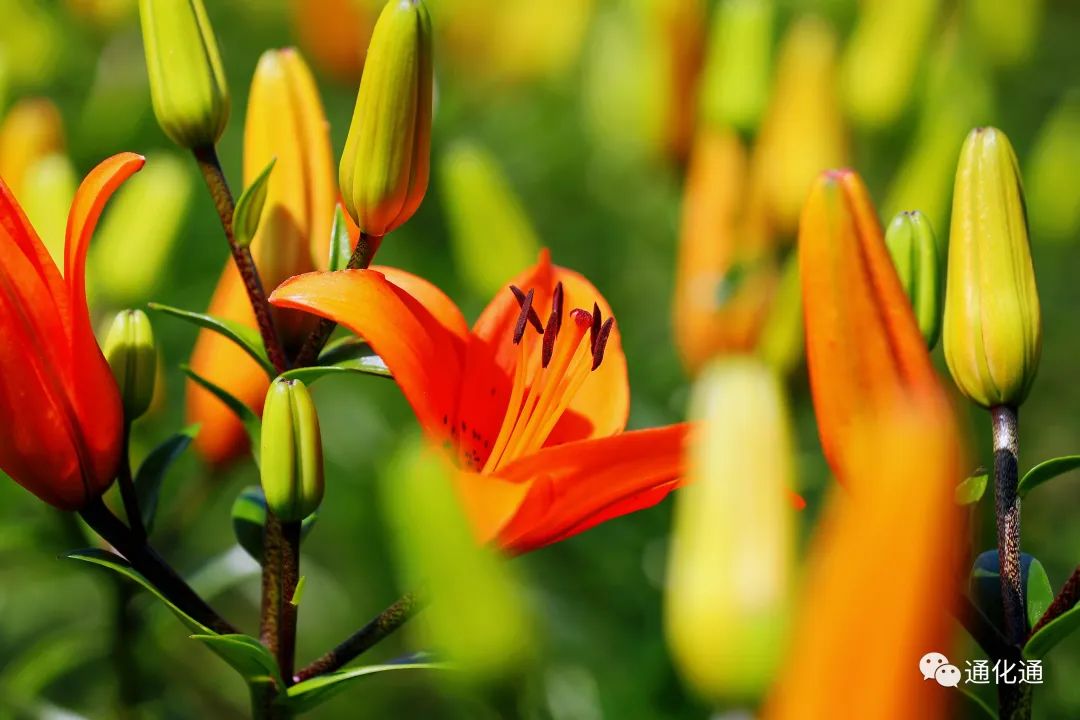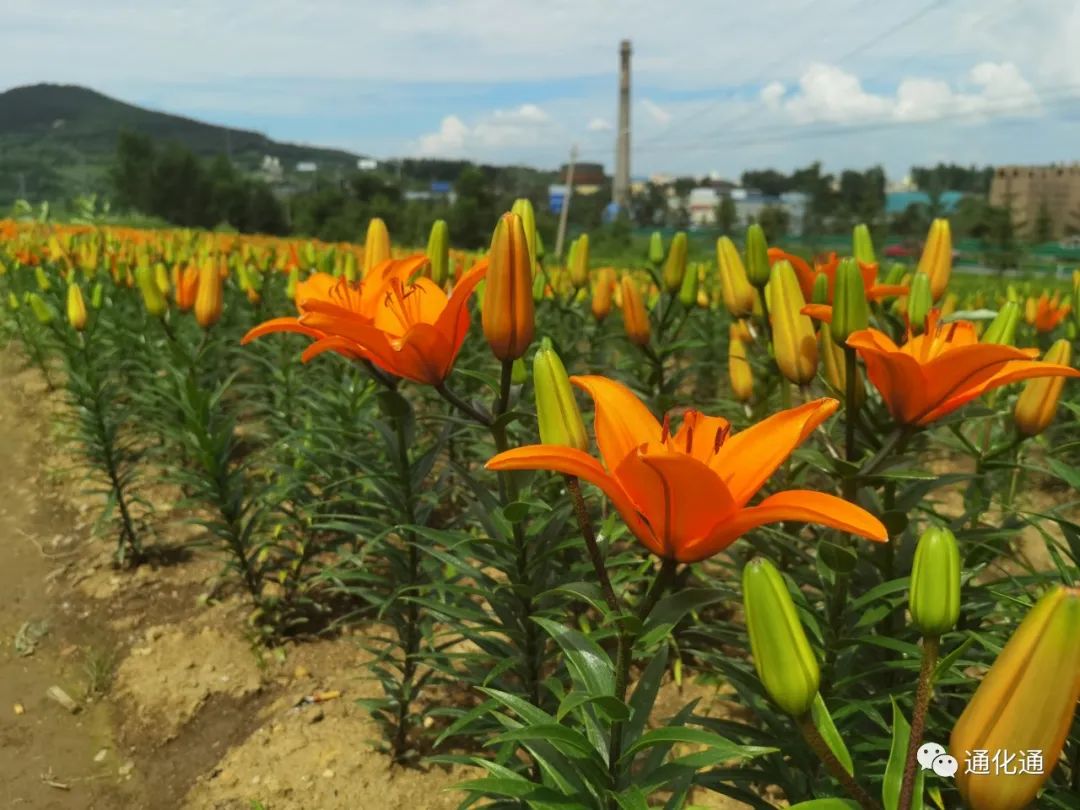 蓝天白云下,娇俏艳丽的橙色、红色百合花成片绽放,一幅绚丽多彩的乡村美景铺展开来。