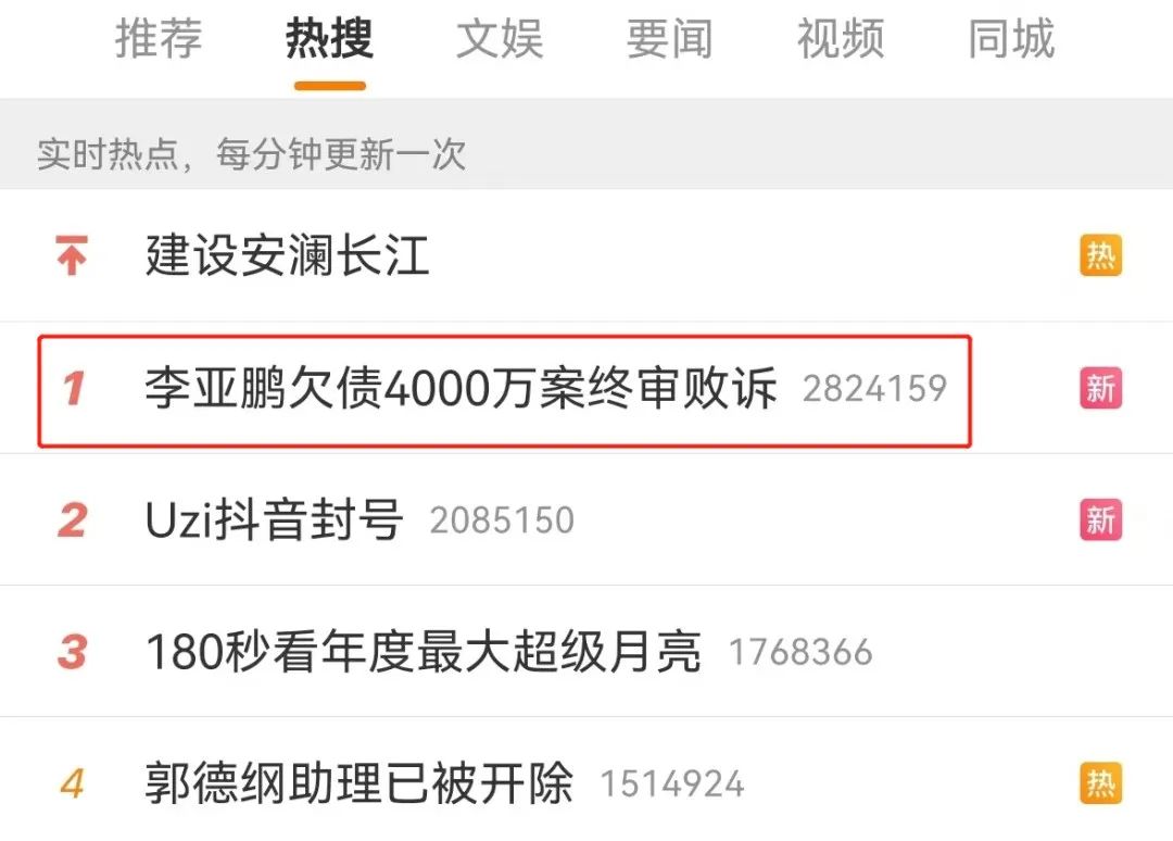 据红星新闻14日报道,7月6日,北京市第三中级人民法院对李亚鹏“欠债4000万元”一案做出终审判决,法院判决,驳回李亚鹏及其哥哥李亚炜的上诉,维持原判。