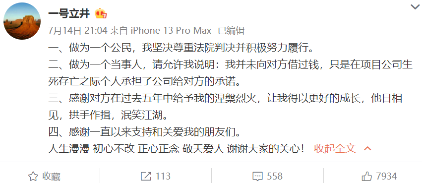 7月14日晚,李亚鹏在个人微博回应表示,“做为一个公民,我坚决尊重法院判决并积极努力履行。我并未向对方借过钱,只是在项目公司生死存亡之际个人承担了公司给对方的承诺。”