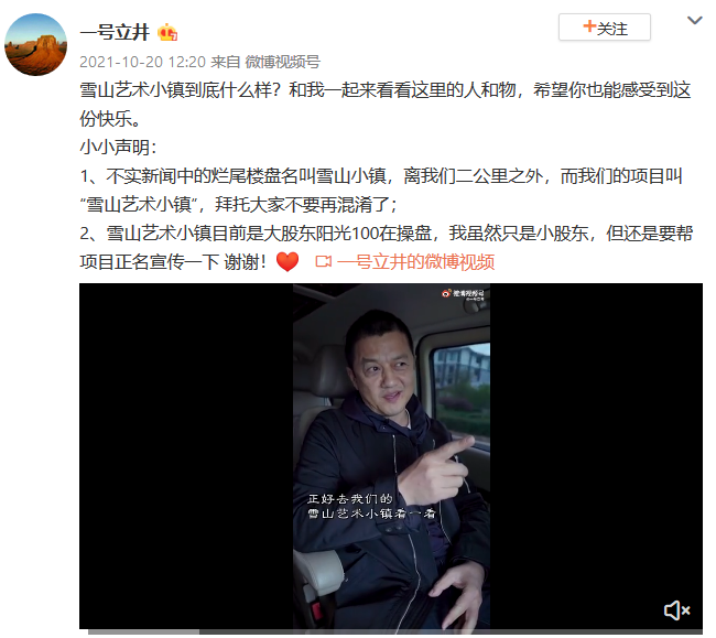 值得一提的是,2021年10月20日,李亚鹏在其微博账号“一号立井”上发表声明:“不实新闻中的烂尾楼名叫雪山小镇,离我们二公里之外,而我们的项目叫雪山艺术小镇,拜托大家不要再混淆了。雪山艺术小镇目前由大股东阳光100在操盘,我虽然只是小股东,但还是要帮项目正名宣传一下。”