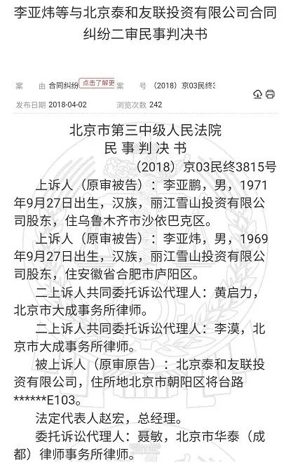 此前,李亚鹏等人在丽江开发房地产项目并与北京泰和友联投资有限公司产生纠纷,双方从2015年12月开始对簿公堂,该案件经过了6次庭审程序,其中包括一次再审程序和一次重审程序。