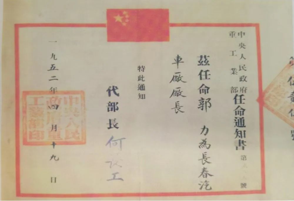 1952年4月中央人民政府重工业部任命郭力为长春汽车厂厂长通知书