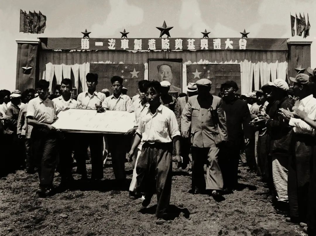 1953年7月15日,第一汽车制造厂举行奠基仪式。“奠基典礼大会在鼓乐齐奏、鞭炮齐鸣声中开始,当主席台两侧塔吊上的两面五星红旗徐徐升起时,全场掌声雷动,欢呼声此起彼伏。”