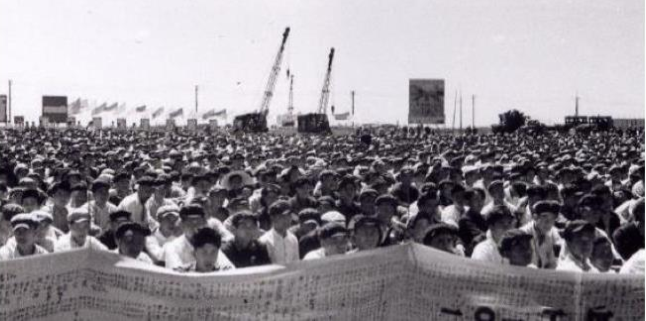 1953年7月15日,李岚清等6名青年共产党员抬着刻有毛泽东同志题词的奠基石进入会场