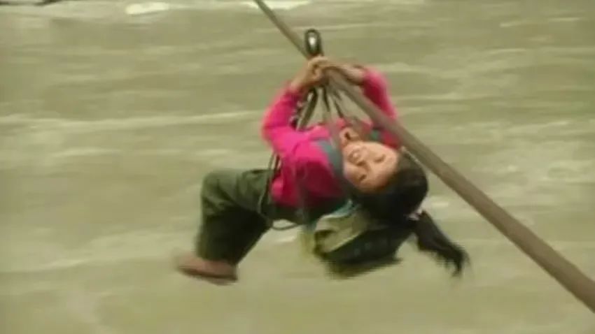 人生第一次见到桥的余燕恰,在走到桥中央后,望着桥下汹涌的怒江水,反而因害怕而停步不前。最后是在现场人员的搀扶下,走了过去。