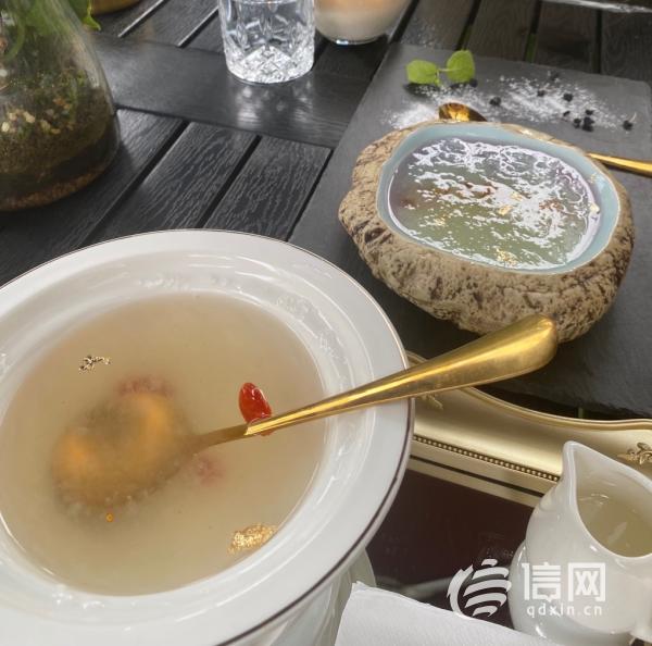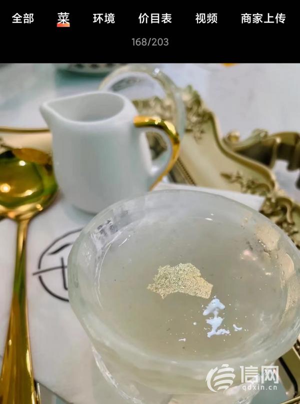 为了落实情况,信网记者于7月13日来到该店,点了店内的特色菜品:单价98元的原味冰糖燕窝和单价198元的璀璨星空燕窝。餐品上齐后,两盏燕窝的确有不少轻薄的金色碎片,在阳光照射下闪闪发亮,很像金箔。信网记者随后将情况反映给了市南区市场监督管理局。