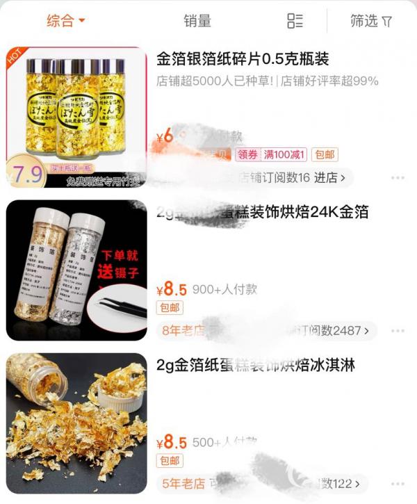 跟“金箔”沾边的食物,会因为“吸睛”被不少消费者选购。信网在某网购平台输入关键词“金箔”进行搜索,还是能看到大量商家在售卖。其中一商家表示,金箔的用途标注的是装修材料,工艺品制作、美容、装饰等,购买后用于装饰食品是一些不法商家的个人行为。该店铺客服人员表示,他们所销售的金箔质量很轻,0.1克装的金箔在该店的售价为22元。