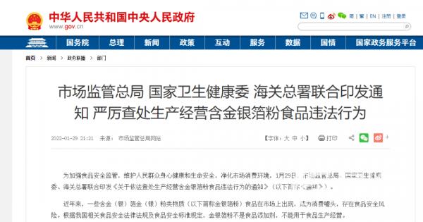 信网获悉,在由国家市场监管总局、国家卫生健康委、海关总署联合印发《关于依法查处生产经营含金银箔粉食品违法行为的通知》(以下简称《通知》)明确指出,各有关部门要加大执法力度,严厉打击生产经营含金银箔粉食品的违法行为,严厉打击虚假宣传金银箔粉可食用的违法行为,严厉打击进口含金银箔粉食品违法行为。相关违法行为一经查实,一律依法从严从重从快查处;涉嫌犯罪的,一律依法移送公安机关追究刑事责任。