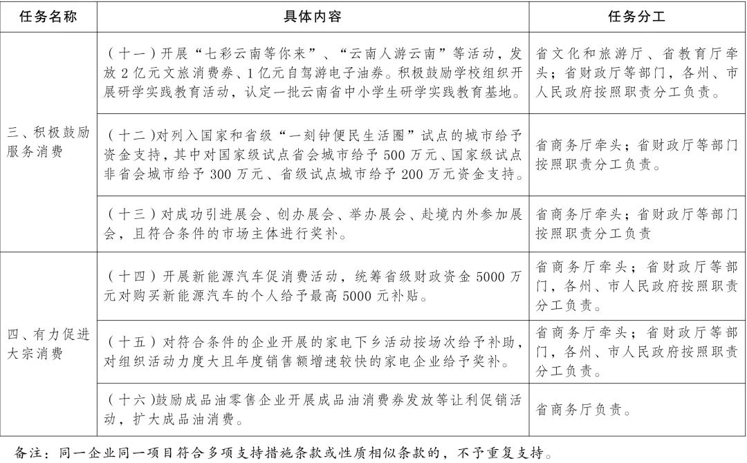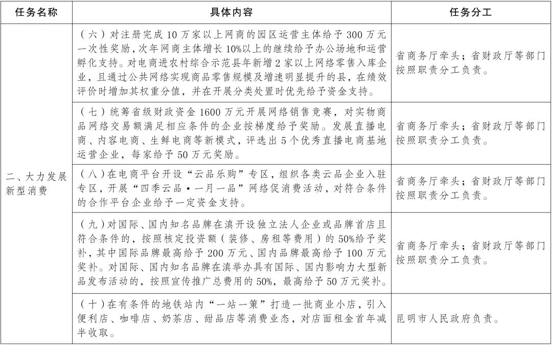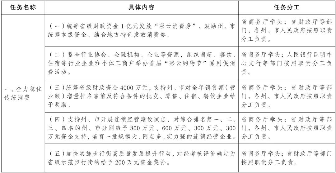 (十九)打造消费中心城市。支持昆明建设立足国内、辐射南亚东南亚和环印度洋地区的国际消费中心城市,支持有条件的州、市建设区域性消费中心城市。建设边境特色消费城市,推动瑞丽、河口、勐腊(磨憨)等地打造集商业中心、批发市场、免税购物等多元化、多层次、全生态的消费场景。加大品牌新品首发活动和首店落户支持力度,做强“首店经济”和“首发经济”。支持州、市加快消费基础设施建设,改善提升服务环境。