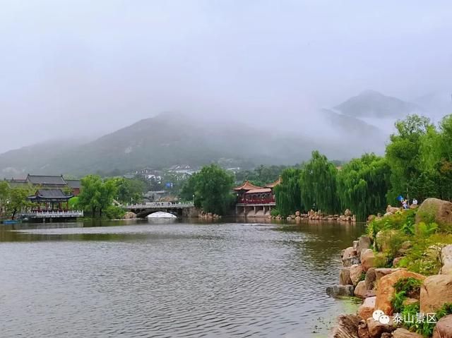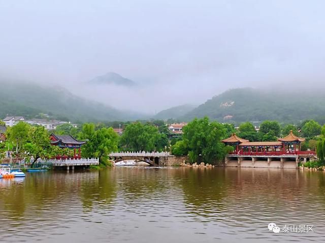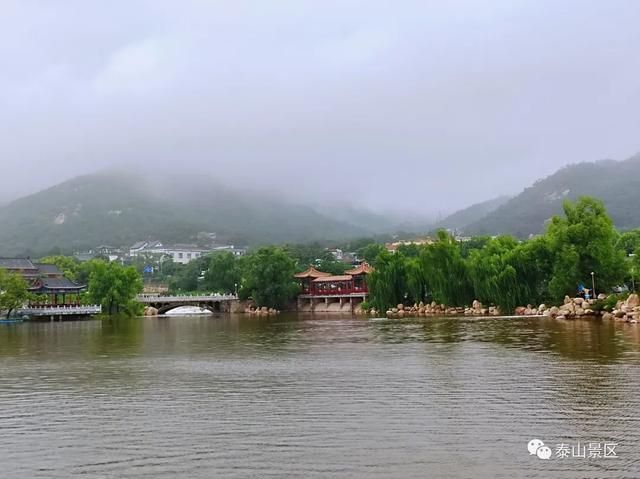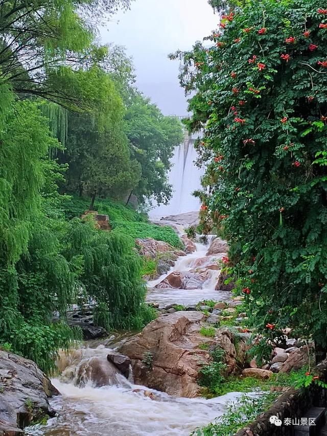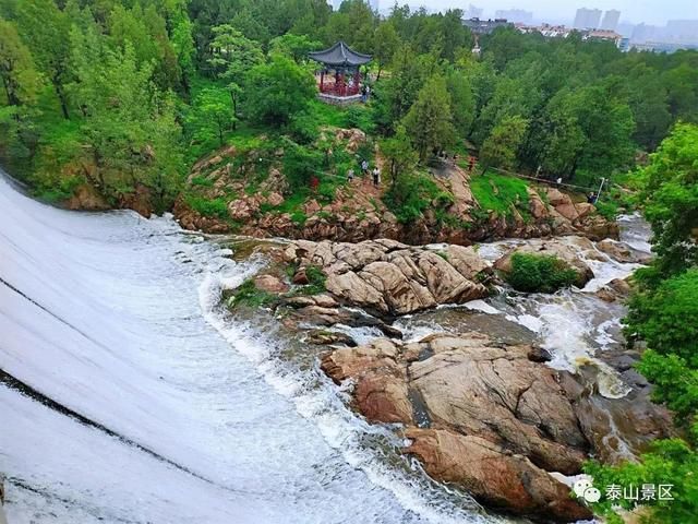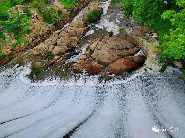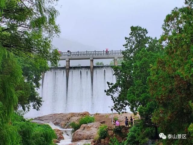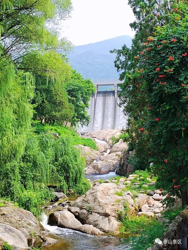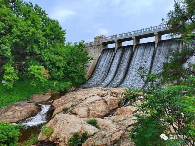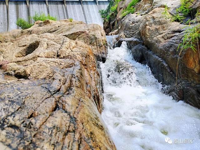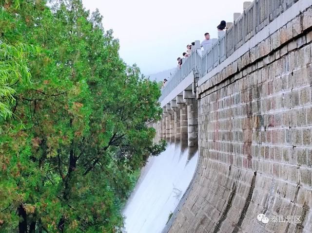 犹如长龙的虎山水库大坝,横亘在溪谷中间,将上游来水拦截在坝内。走在上面,凉风习习,惬意非常!凭栏俯瞰,瀑布很宽,水从几丈高的岩石上泻下来, 飞溅起阵阵白色的雨雾。涧谷内怪石嶙峋,溪水潺潺,树木葱郁,虬在湾、王母池、八仙桥、王母桥等景点、市区高楼建筑及泰城风光一览无余,多么壮丽的景色,真叫人心神怡。