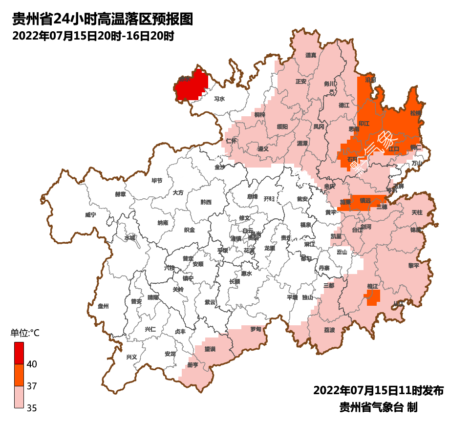 据贵州省气象台预报,7月15日夜间到16日白天,贵州省的西北部多云有阵雨或雷雨,其余地区多云到晴,铜仁市大部、遵义市大部、黔东南州大部、黔南州南部边缘、黔西南州东南部边缘午后有35℃以上高温,东北部局地超过37℃,赤水河谷超过40℃,贵州省的中北部地区有4~6级偏南风,瞬时风力可达6级以上。