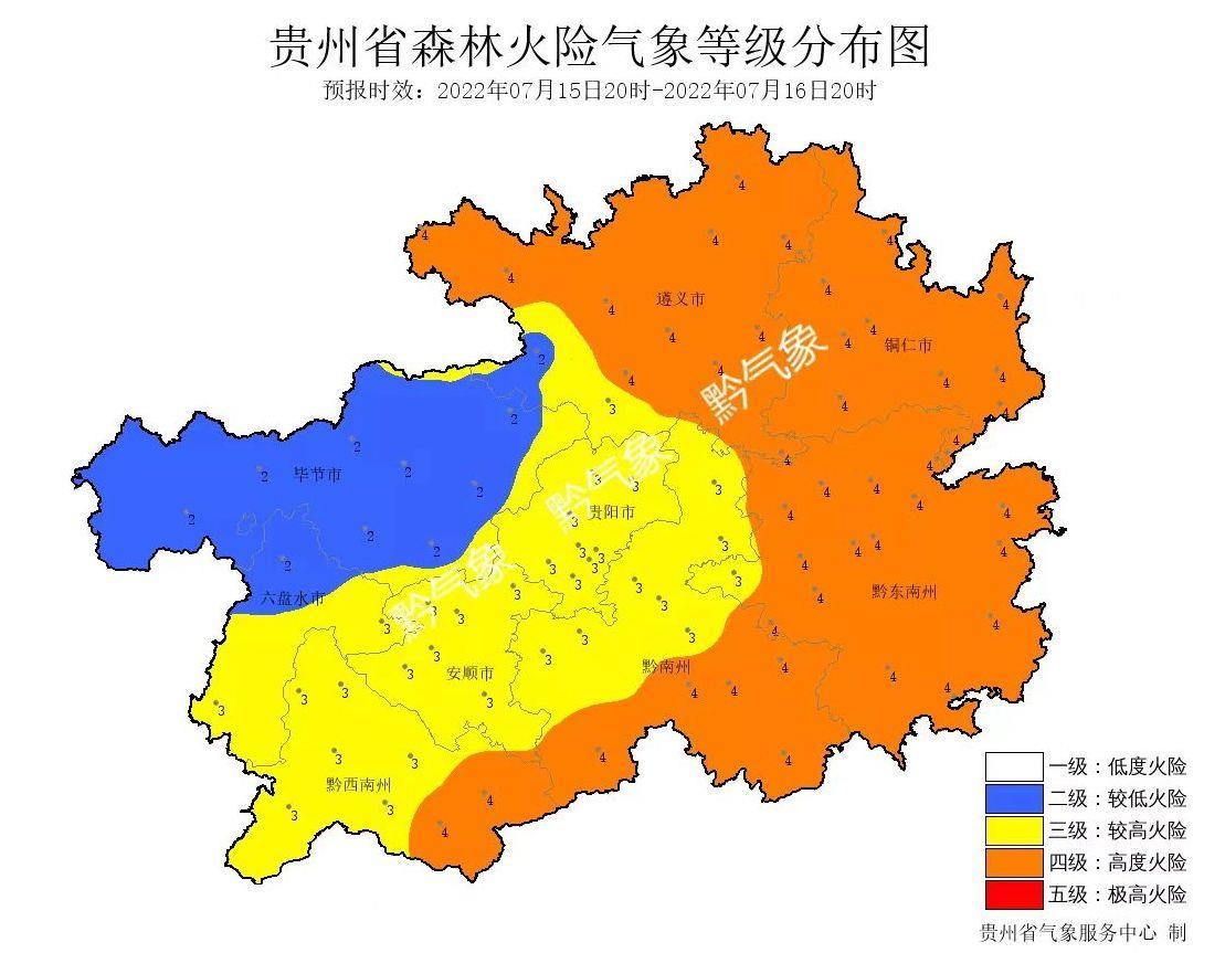 7月15日20时到16日20时,贵州全省大部地区森林火险气象风险等级较高,为3级(中度),其中贵州省的北部及西部边缘地区森林火险气象风险等级高,为4级(高度)。贵州气象部门提醒,高温天气应避免外出活动,外出应采取必要的防晒措施,不要长时间在太阳下暴晒。注意用火用电安全,不要携带火种进入林区,同时要做好蓄水保水工作,节约用水。