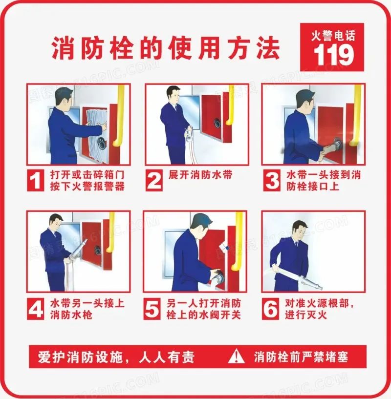 注:如果在火场中,是电引起的起火要确定切断电源,不然会发生触电。还有就是开启消防栓的柜子,通常消防柜是没有锁的。