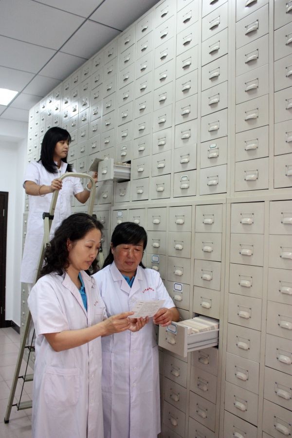 严亚琼(左一)和同事一起整理肿瘤卡。