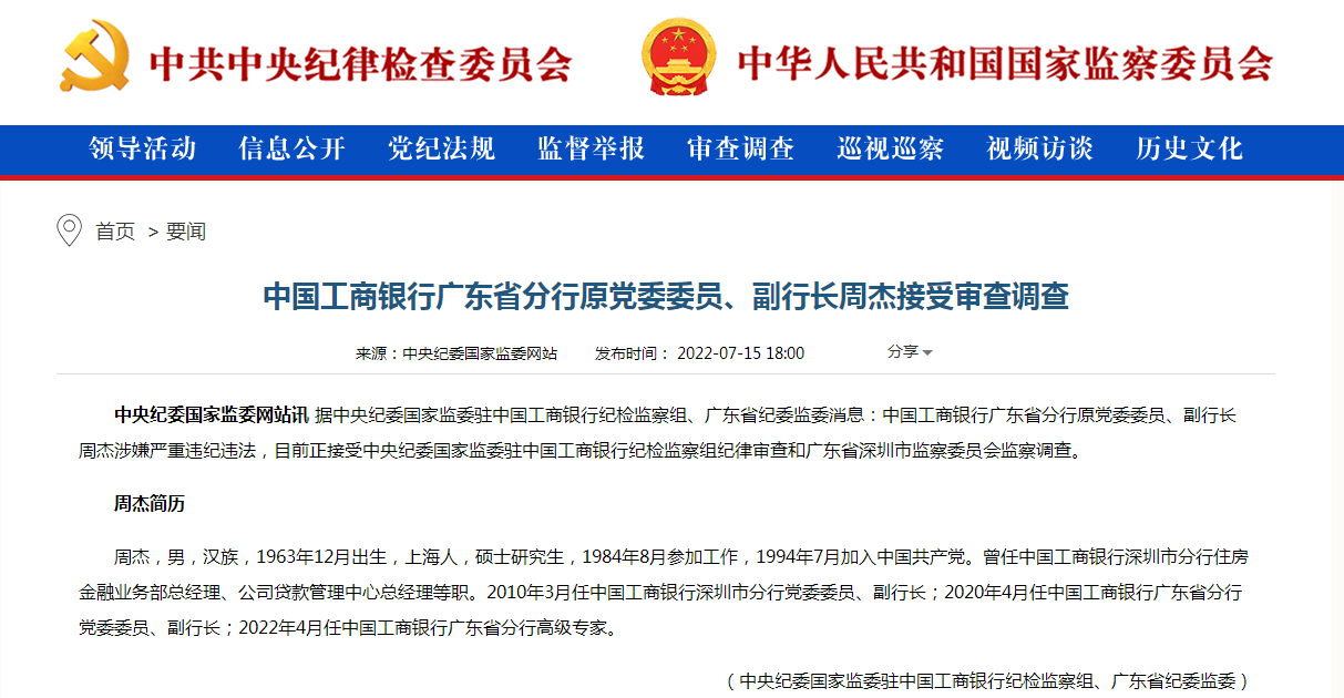 7月15日,据中央纪委国家监委驻中国工商银行纪检监察组、广东省纪委监委消息:中国工商银行广东省分行原党委委员、副行长周杰涉嫌严重违纪违法,目前正接受中央纪委国家监委驻中国工商银行纪检监察组纪律审查和广东省深圳市监察委员会监察调查。